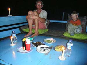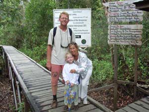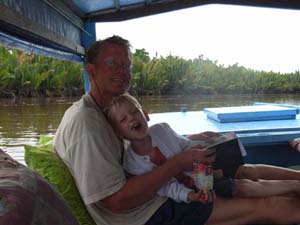 En ik heb ook nog apen gezien, nee niet in de dierentuin, maar in de jungle waar ze echt wonen. Ik vond het best een beetje spannend en toen ik op de bank ging zitten en de aap dichterbij kwam, toen trok ik mijn benen toch maar snel op de bank. Als we gingen wandelen moest ik een lange broek aan en een shirt met lange mouwen omdat er anders wel eens vervelende beestjes mij konden steken. Fijn was dat niet want het was al zo heet! Het leukste van de hele trip vond ik nog dat we met een boot gingen, en mijn mama en papa hoefden niet eens zelf te sturen maar dat deden ander mensen voor ons. S nachts sliepen we op de boot, in de open lucht onder een groot muskietennet. En eten deden we met kaarslicht, gezellig was dat zeg. En de mannen op de boot vonden het erg leuk om met mij te spelen. Ze zagen natuurlijk wel dat ik gewend was om op een boot te wonen, want ik vond het helemaal niet erg als er af en toe een golf voorbij kwam. Ik vond het een hele belevenis.